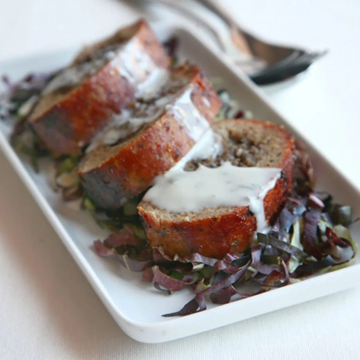 Sobald der BonRoll gekocht ist, schneiden Sie ihn in Scheiben und servieren Sie ihn, übergossen mit der Gorgonzola-Sauce und begleitet von dem Radicchio.