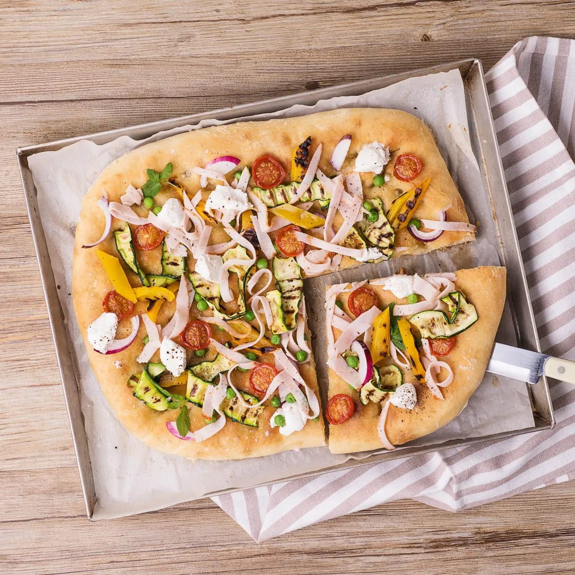 Here is the delicious recipe for crispy focaccia with strips of aeQuilibrium with sweet paprika, grilled vegetables, tomatoes, rings of red onions, peas and mint!