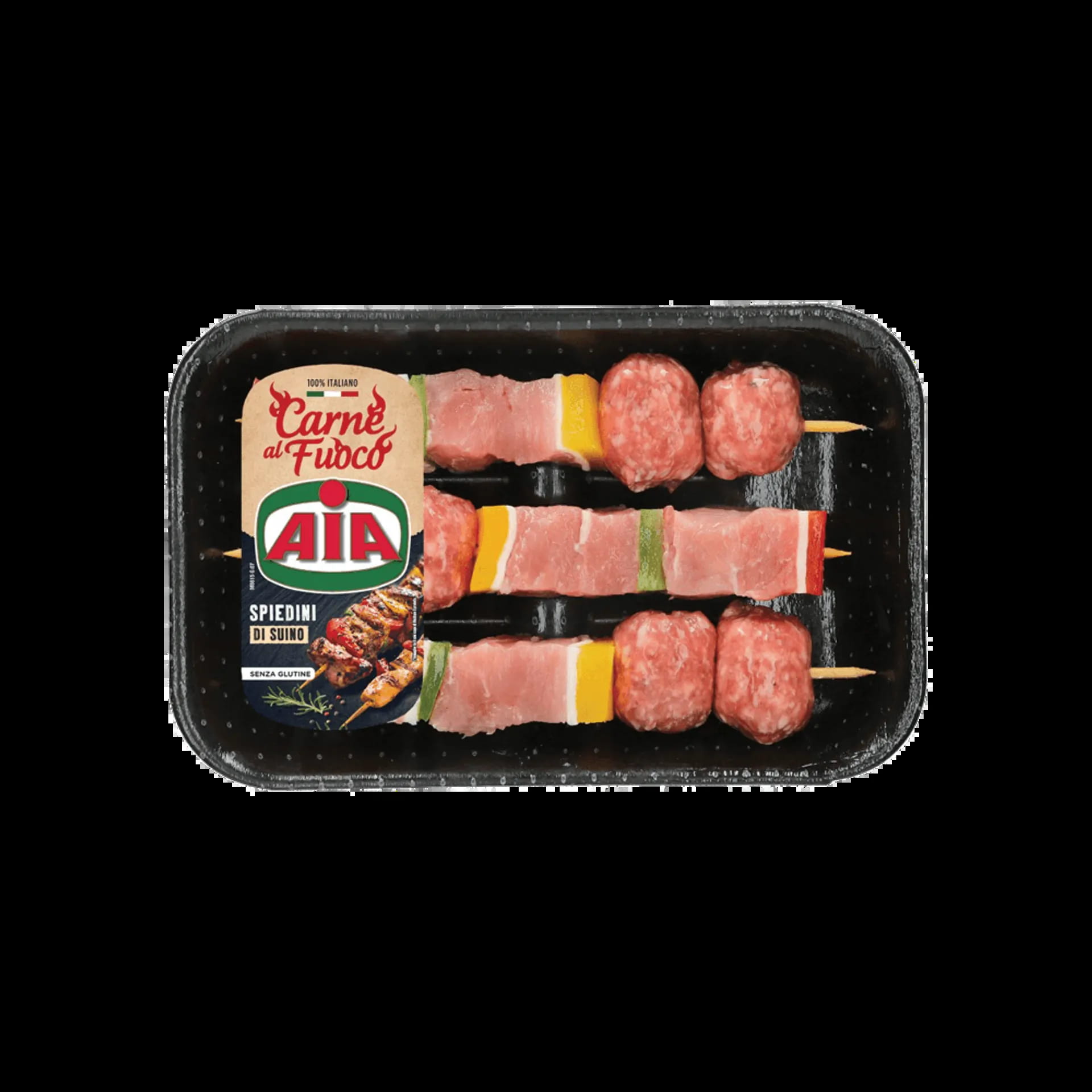 Spiedini di teneri tagli di suino, separati da peperoni e sfoglie di pancetta, accompagnati all'estremità da due chicchi di salsiccia. SENZA CONSERVANTI.