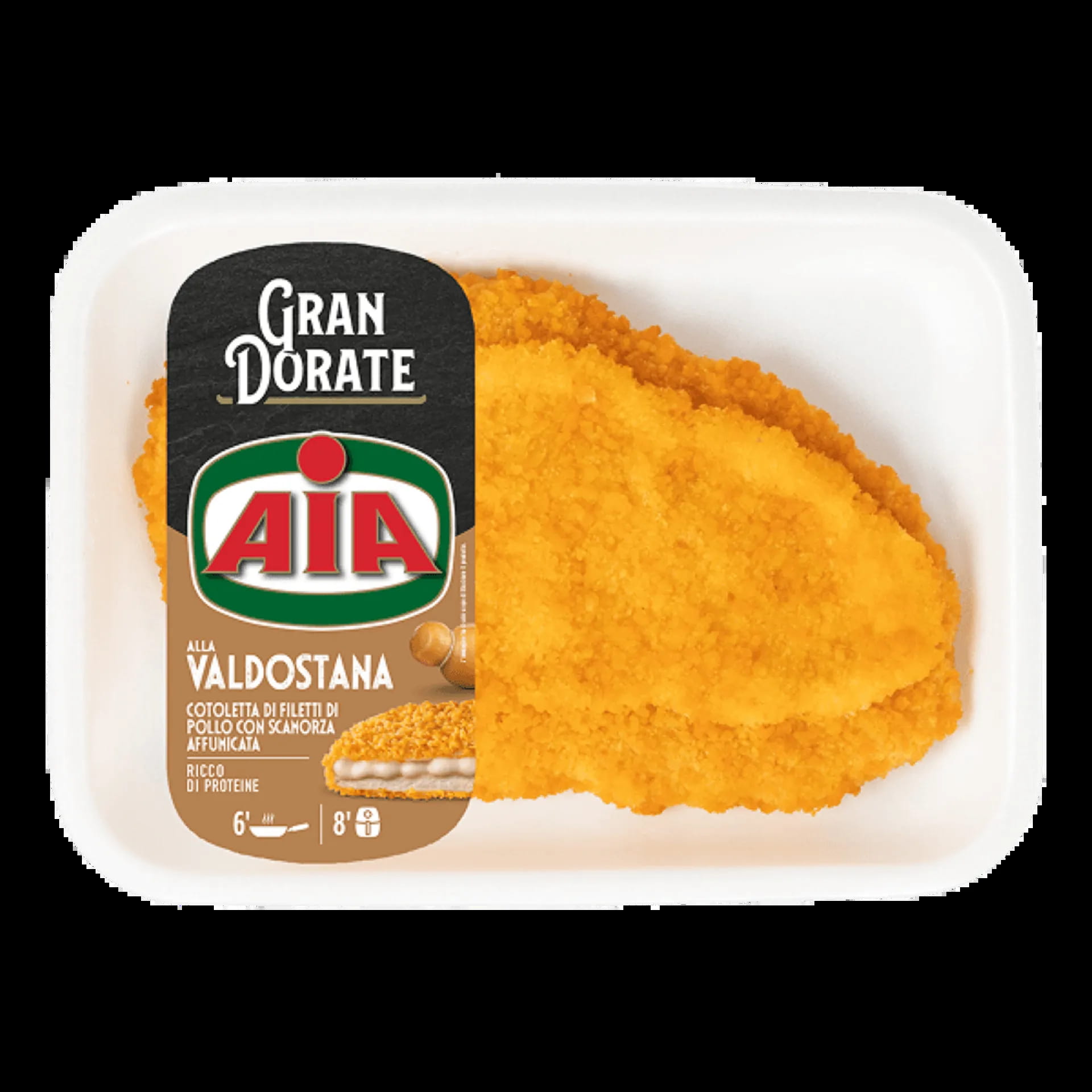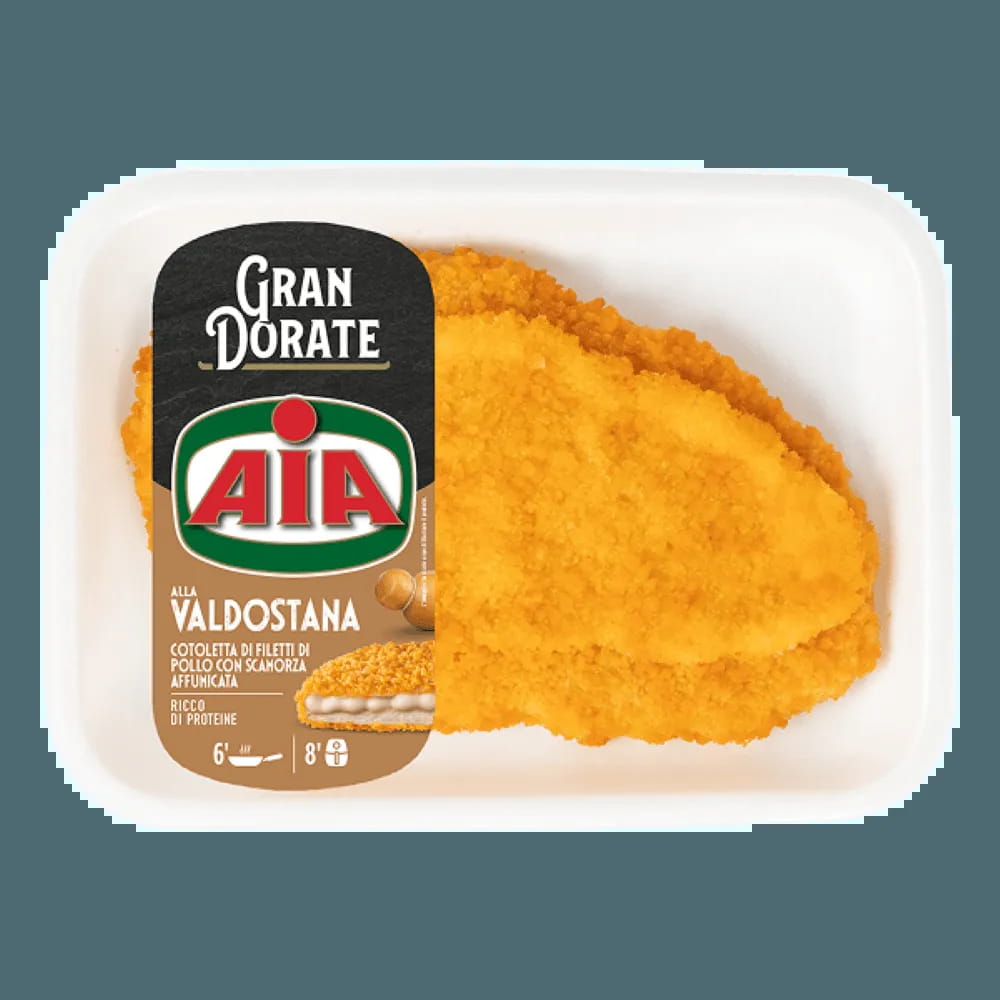 Gustosa cotoletta di filetti di petto di pollo AIA arricchita da un'appetitosa farcitura al formaggio scamorza affumicata.