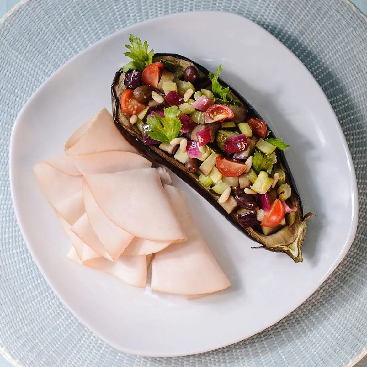Sfornate le melanzane e farcitele con la caponata. Impiattate l’aeQuilibrium con una melanzana farcita di caponata.