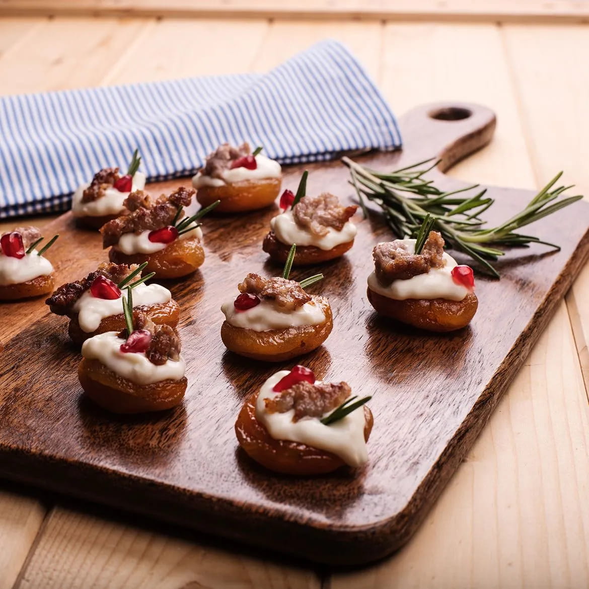 Non c’è modo migliore che iniziare il cenone di Capodanno con un aperitivo sfizioso, elegante e che sia anche di buon auspicio per l’anno nuovo. Le albococche secche con stracchino, salsiccia, melograno e rosmarino, sono piccoli bocconcini che daranno al vostro aperitivo di San Silvestro un sapore unico.