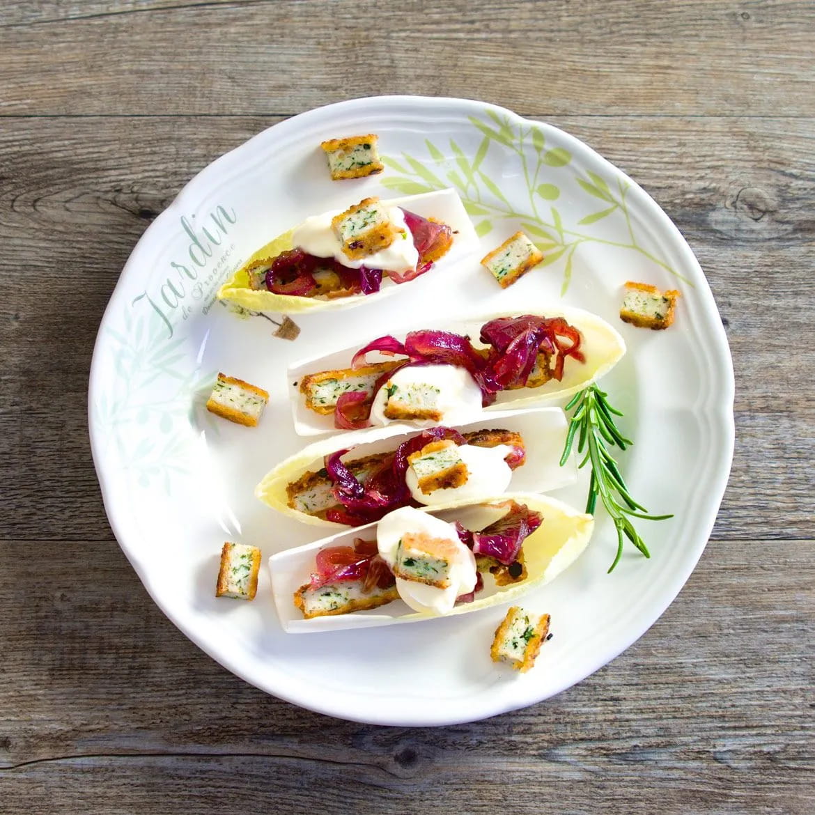 Ecco la ricetta completa delle barchette di indivia con bastoncini di spinacina, marmellata di cipolle e crème fraîche!