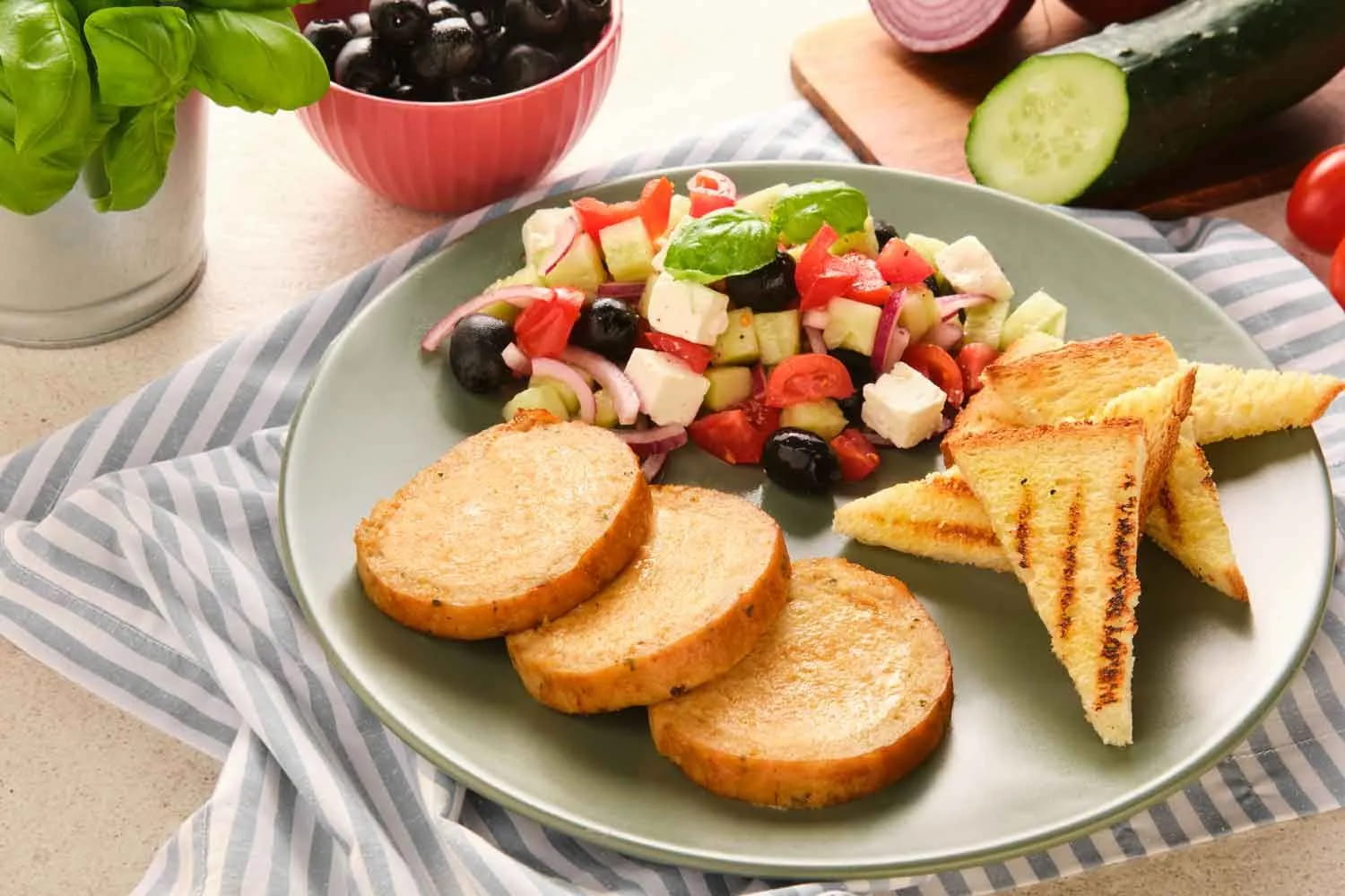 Per preparare il BonRoll classico con insalatina alla greca tagliate il BonRoll a fette e fatelo cuocere su una padella antiaderente con un filo d’olio. Nel frattempo pelate il cetriolo e tagliatelo a cubetti.
