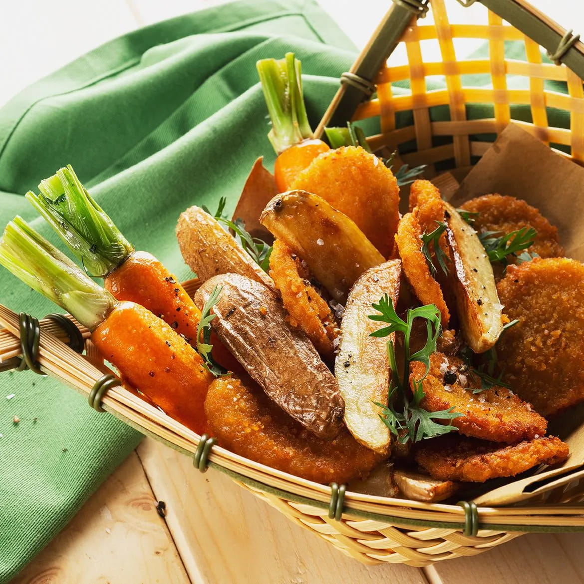 Ecco un ricetta originalissima, perfetta per tutte quelle occasioni in cui avete voglia di una coccola a base di un piatto sfizioso e golosissimo: le chips di pollo con contorno di patate al forno al rosmarino e carote! Pronta in pochi minuti, questa preparazione è la soluzione ideale per serate con gli amici tra una chiacchiera e l’altra o passate alla TV per fare il tifo per la squadra del cuore. Le chicken chips AIA sono croccantissime e ricche di gusto e si sposano alla perfezione con il contorno di patate e carote al rosmarino.
