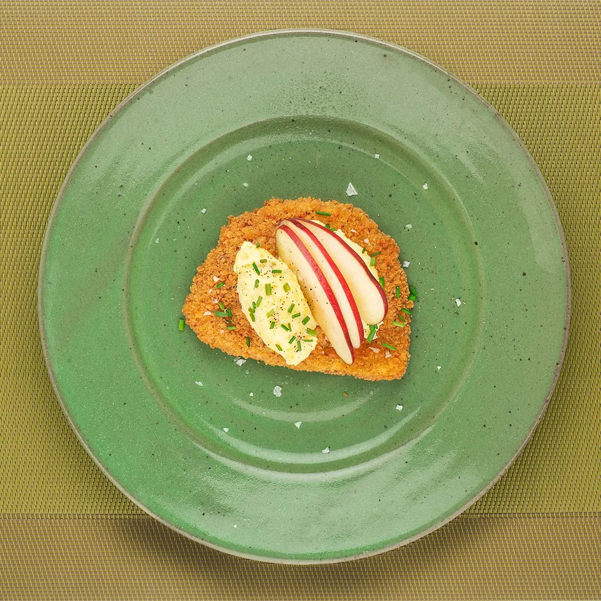 Preparate il Cordon Bleu alla pizzaiola in padella. Impiattate mettendo il Cordon bleu nel piatto, sopra sistemate tre piccole quenelle di patate e mascarpone e decorate con una spolverata di erba cipollina e tre fettine sottilissime di mela.