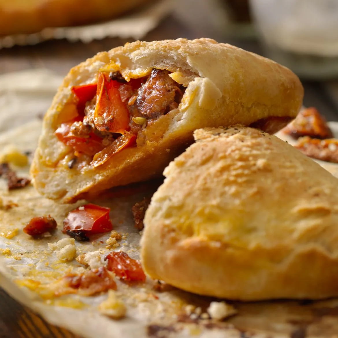 Ora potete farcire e cuocere la vostra velocissima focaccia in padella: sul primo cerchio di pasta adagiate la farcitura di salsiccia e formaggio, quindi chiudete con il secondo e sigillate bene i bordi.