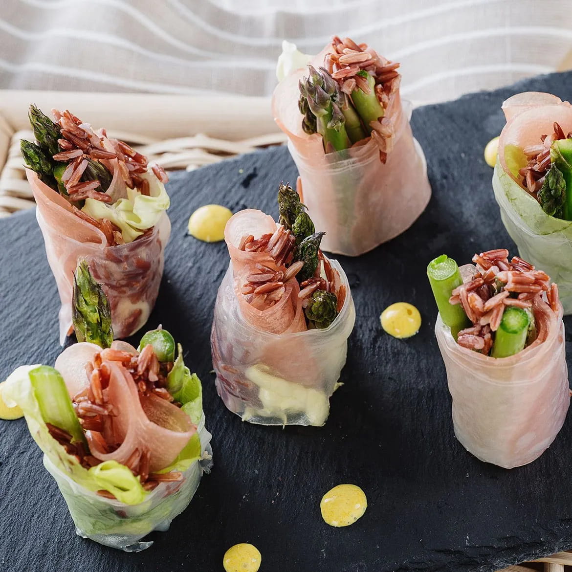 Stendete un foglio di carta di riso su un piano, coprite con una foglia di insalata, aggiungete il riso rosso, un paio di asparagi, i semi, due fette di bresaola arrotolate e condite con la salsa alla curcuma.