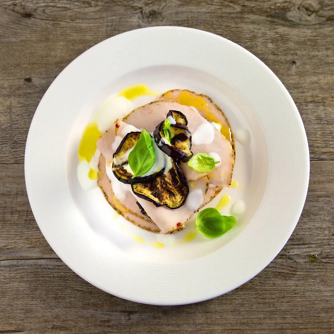 Sul piatto da portata, mettete una fetta di tacchino a fiocchetto, coprendola con una fetta di melanzana, una foglia di basilico e un velo di salsa. Ripetete con un altro strato e servite.