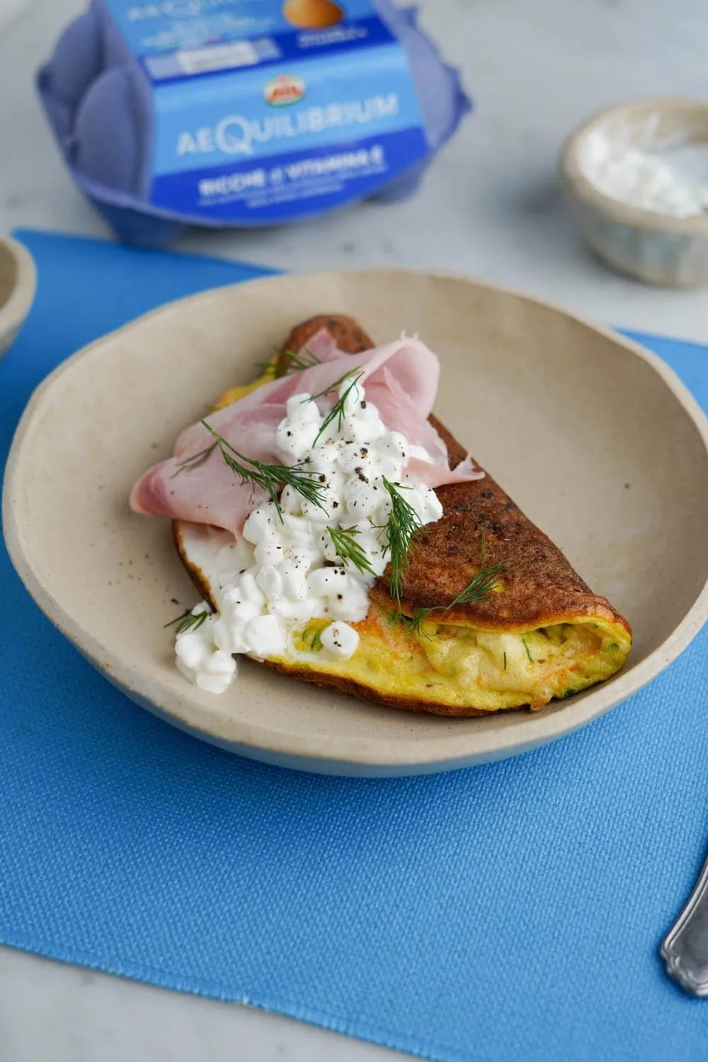 Farcisci con Prosciutto Cotto Magro AeQuilibrium e fiocchi di latte, poi completa con aneto fresco e una macinata di pepe.