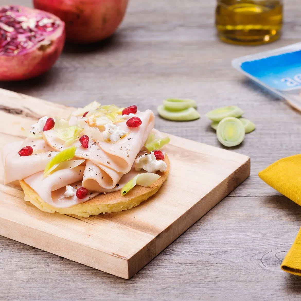 Componete il vostro spuntino delle feste adagiando sul pancake, in sequenza, il petto di pollo al forno aeQuilibrium AIA, il porro brasato, qualche fiocchetto di ricotta, un pizzico di pepe e i chicchi di melograno.