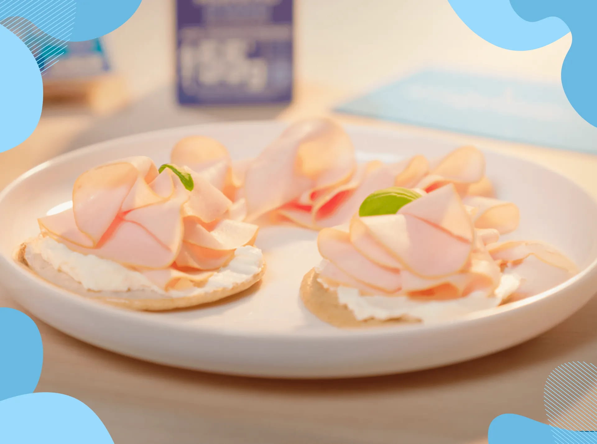 Una volta cotti guarniteli con del formaggio spalmabile e della fesa di tacchino.