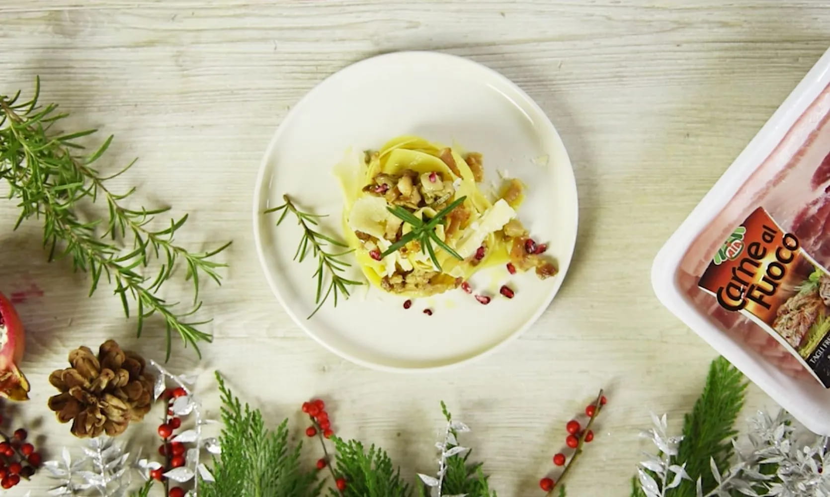 Ecco la ricetta originale delle pappardelle al ragù bianco di funghi e pancetta con chicchi di melograno!