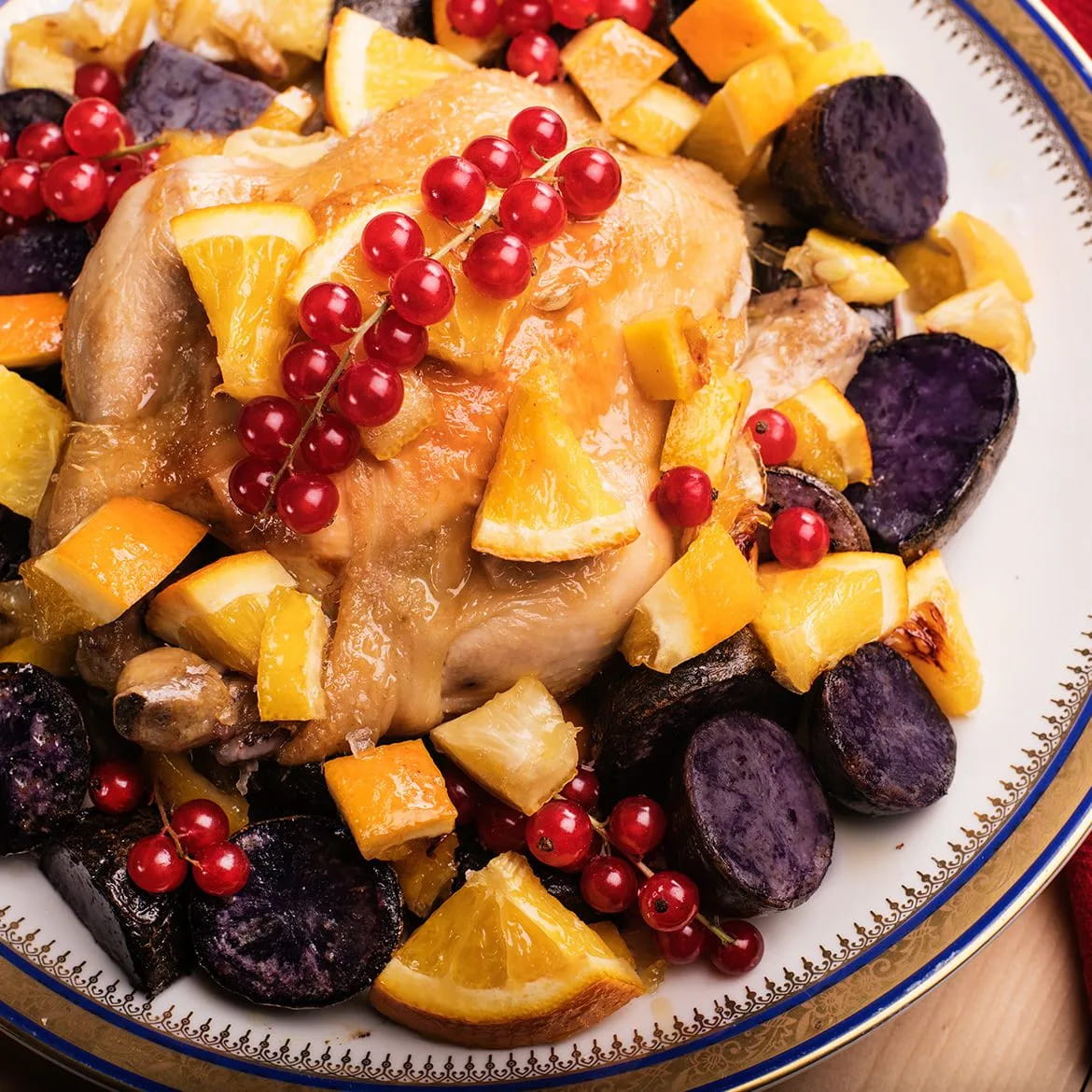 Il pollo agli agrumi con patate viola e ribes è una ricetta perfetta per la tavola del Natale in famiglia, ma anche per quelle cene invernali in cui stupire i vostri ospiti con un piatto bello e buono.