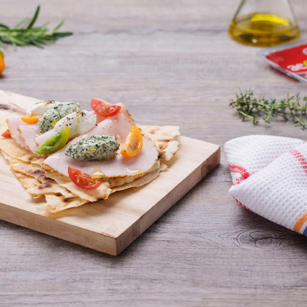 Se siete stanchi dei soliti stuzzichini con cui spezzare la fame, vogliamo darvi uno spunto culinario originale e facilissimo da preparare: la sfoglia di pane carasau con aeQuilibrium, pesto di erbe, pomodorini e ricotta.