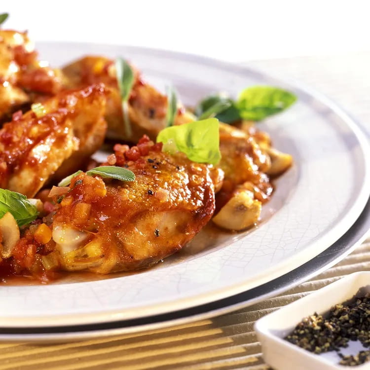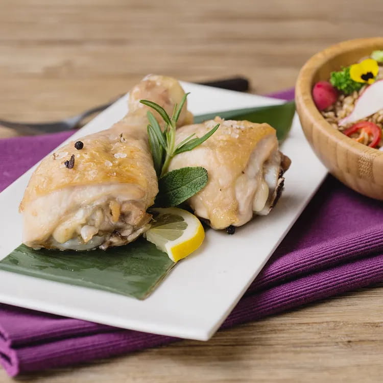 Portate a cottura i funghi; tritate il prezzemolo e sistematelo poi sui funghi cotti. Nella stessa padella della cottura dei funghi, fate rosolare le sovracosce con la loro marinata, sfumate con brodo o acqua e portate a cottura. Impiattate e servite. Buon appetito!