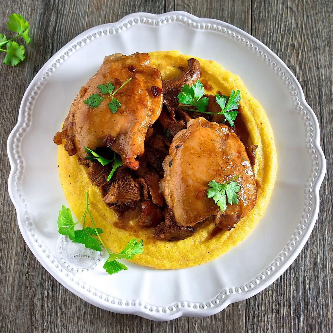 Sovracosce di pollo al miele con polenta al curry e funghi