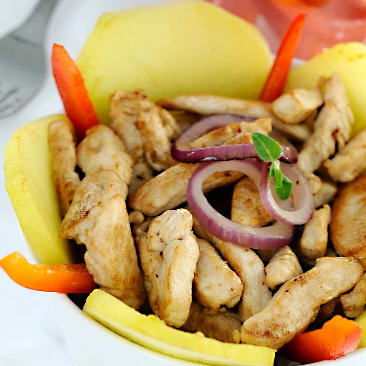 Tagliate la cipolla in fettine sottili e fatele appassire in una padella con un filo di olio EVO, dopo di che aggiungete il peperone rosso, mondato e tagliato in pezzetti non troppo grossi. Aggiungete un pizzico di peperoncino e aggiungete gli straccetti di pollo e dopo un paio di minuti le patate.