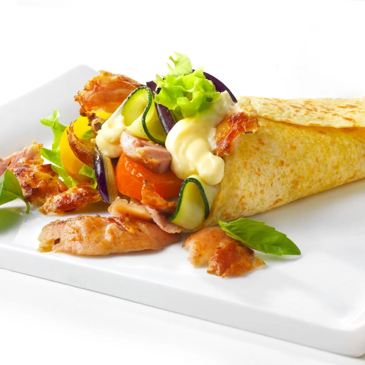 Nel frattempo, in un’altra padella, ben calda, versate un filo di olio e fate scaldare le tortillas. Quando sarà tutto pronto spalmate le tortillas con la maionese mescolata alle erbette miste e a un po’ di pepe quindi farcite con il kebab e le verdure.