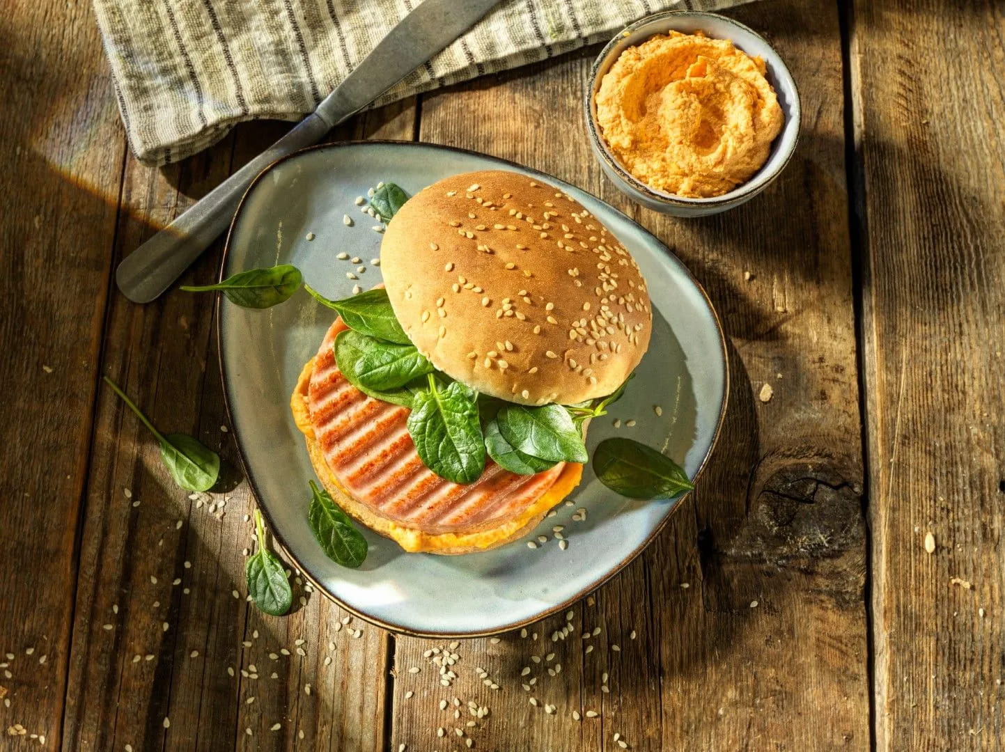 Wudy Burger con hummus di carote e spinacino