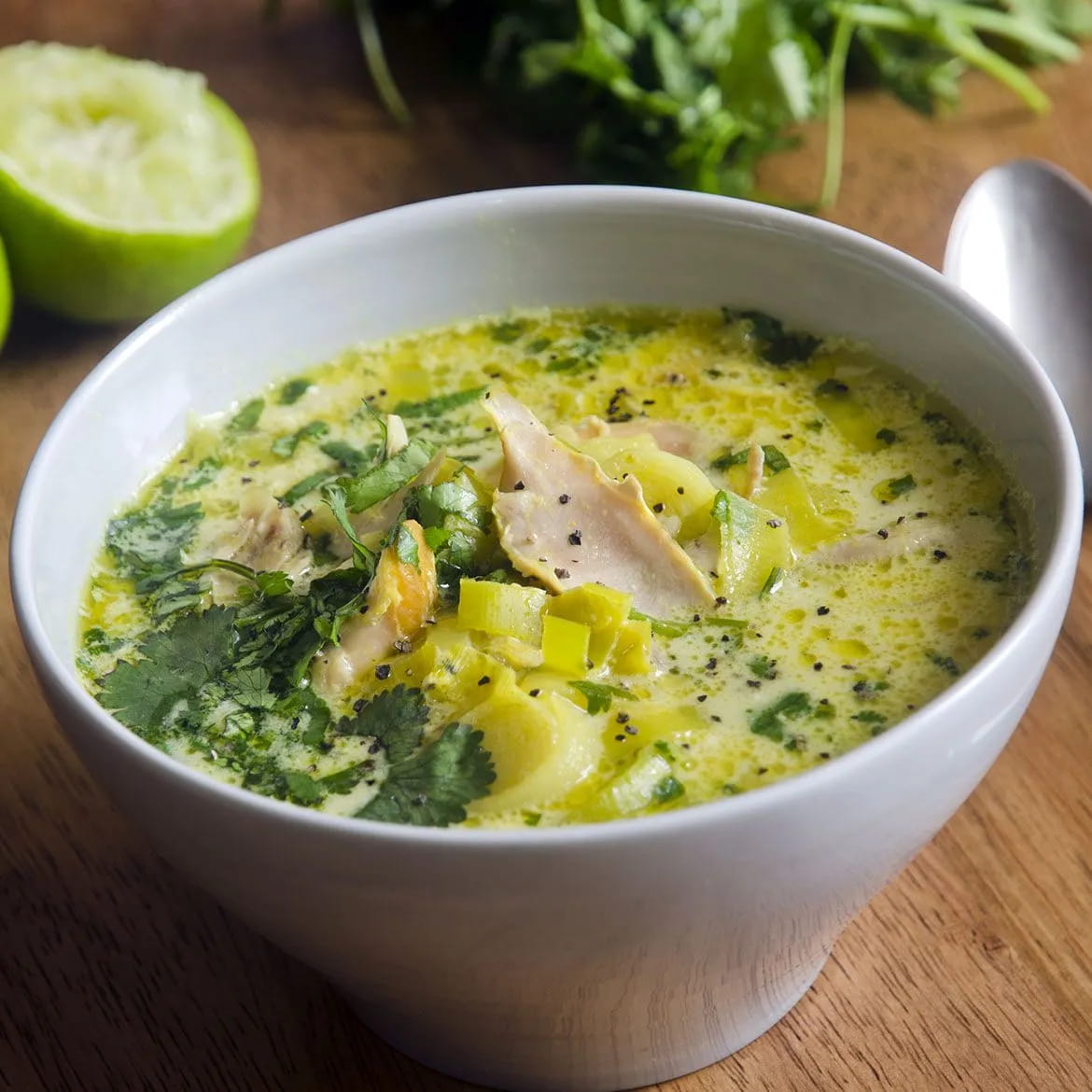 Zuppa di porri, latte di cocco e pollo al curry